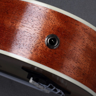 ▲ボディーのトップはスプルース単板。サイドとバックはアフリカンマホガニ合板です。