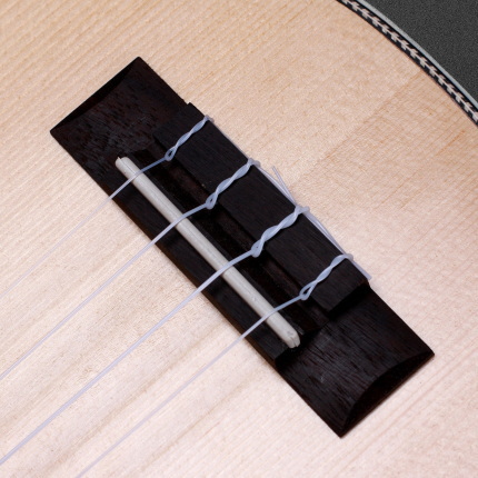 ▲弦は、アクィラ。レギュラーチューニング。ブリッジに巻きつけるタイプ