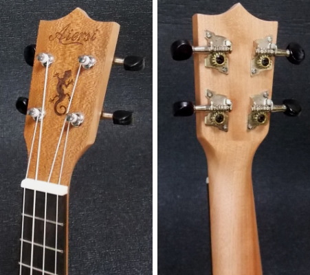 ▲ヘッドに レーザー彫刻で ゲッコーと Aiersi のロゴ ペグはオープンバックのギア式