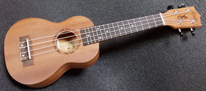 ▲作りは ai10 のソプラノと全く同じで、サウンドホールとヘッドプレートにゲッコーの装飾があります。