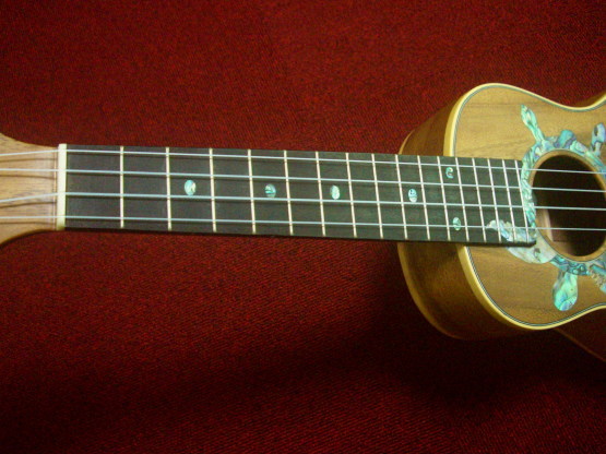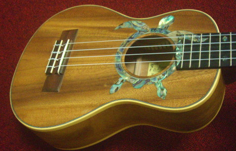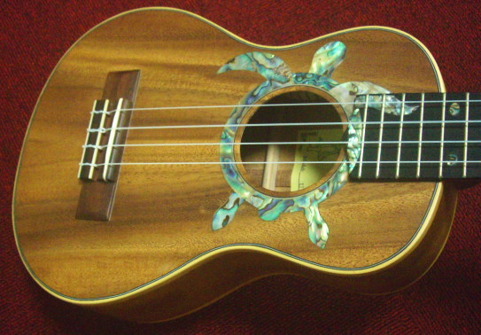 サムズ工房のコンサートサイズのウクレレです。サウンドホールをグリーンアバロンのホヌ(亀)が施されています。