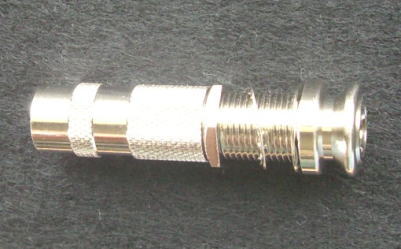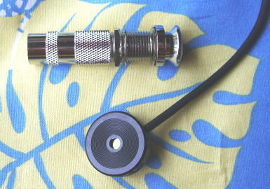 | プリアンプを使う、使わないにかかわらず、振動を電気信号に変えたあとは、ウクレレから外に出さなければなりません。その繋ぎが下のパーツです。使い方は簡単、シールドケーブル(アンプにつなぐコード)をグサッと突き刺します。 |